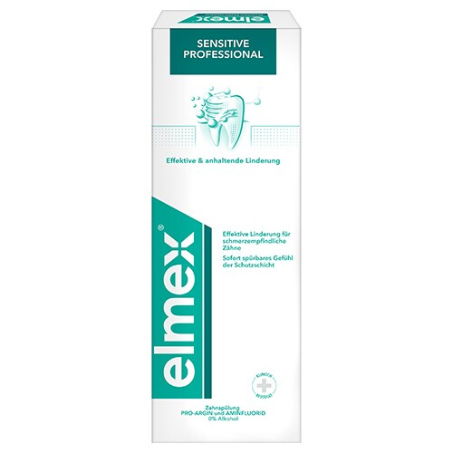 Apa de gură elmex® SENSITIVE PROFESSIONAL cu tehnologia Pro-Argin pentru apă de gură oferă dovedit clinic calmare eficace și de lungă durată a durerii dinților sensibili.1